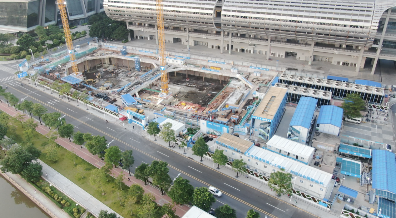 中建八局廣交會(huì)展館四期項(xiàng)目經(jīng)理許本盈介紹,由于指揮中心基坑北側(cè)無(wú)限接近規(guī)劃紅線(xiàn)、東側(cè)與酒店地下室共用地連墻等原因,導(dǎo)致基坑施工過(guò)程無(wú)法形成環(huán)路,且南側(cè)和西側(cè)場(chǎng)地寬度僅有7至8米,占地面積十分狹小。