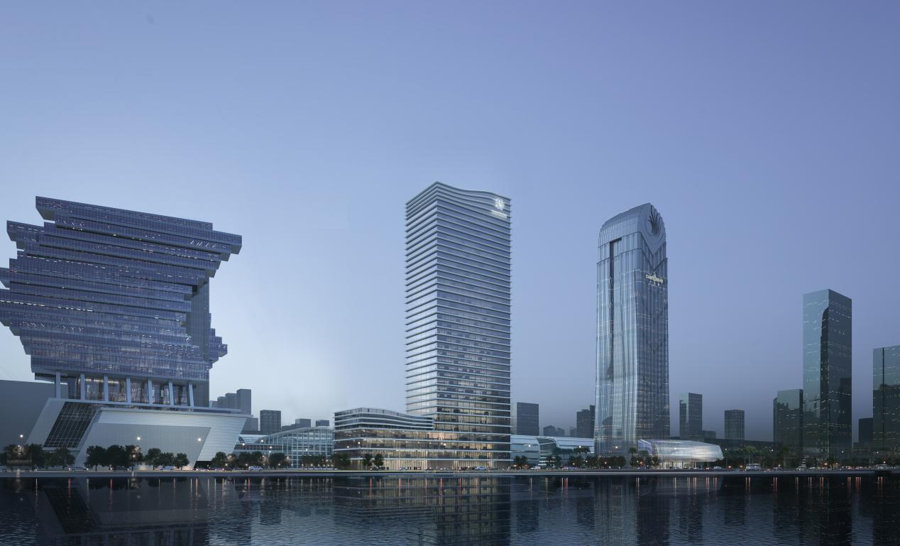 據(jù)悉,廣交會(huì)展館四期項(xiàng)目東地塊結(jié)構(gòu)體系為框架-核心筒體系,塔樓共35層,主屋面標(biāo)高149.32米。主屋面以上還有4層核心筒炮樓和6道花架梁構(gòu)成的塔冠結(jié)構(gòu),花架梁最高部位標(biāo)高171.82米,最低處166.42米,整體呈飄帶狀,與廣交會(huì)展館遙相呼應(yīng)。